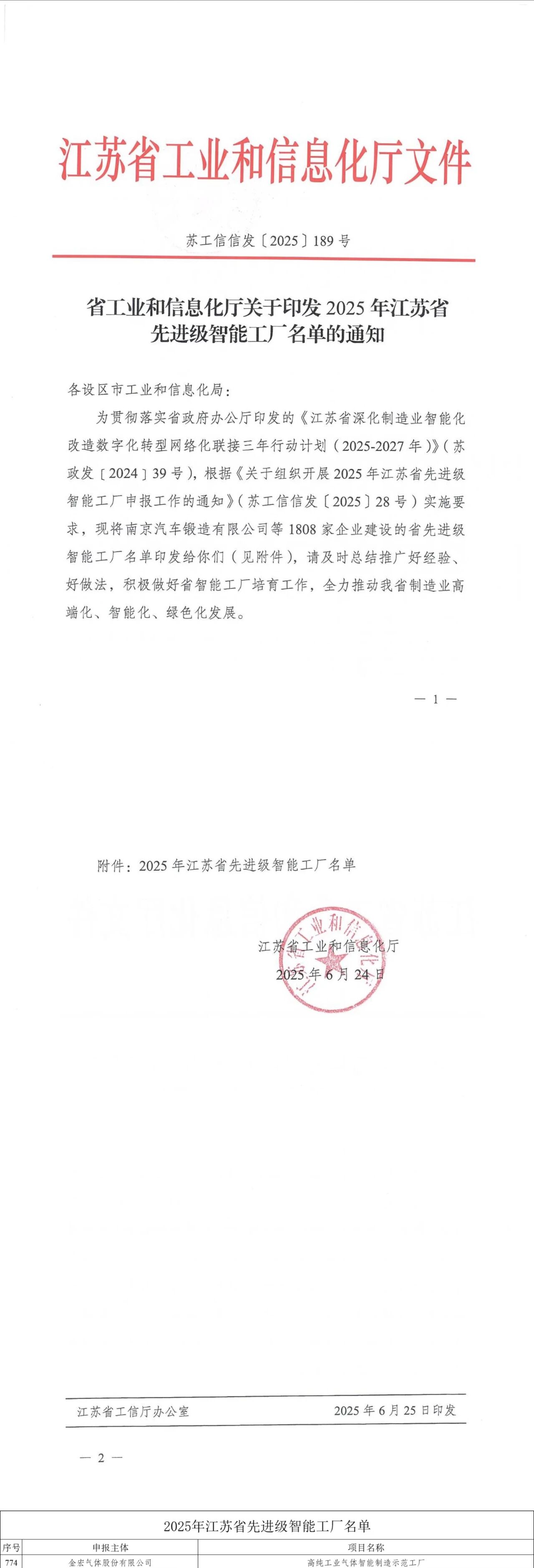 近日,江蘇省工業和信息化廳印發了《2025年江蘇省先進級智能工廠名單》的通知,金宏氣體憑借在智能制造領域的卓越實踐與創新成果,成功躋身榜單。